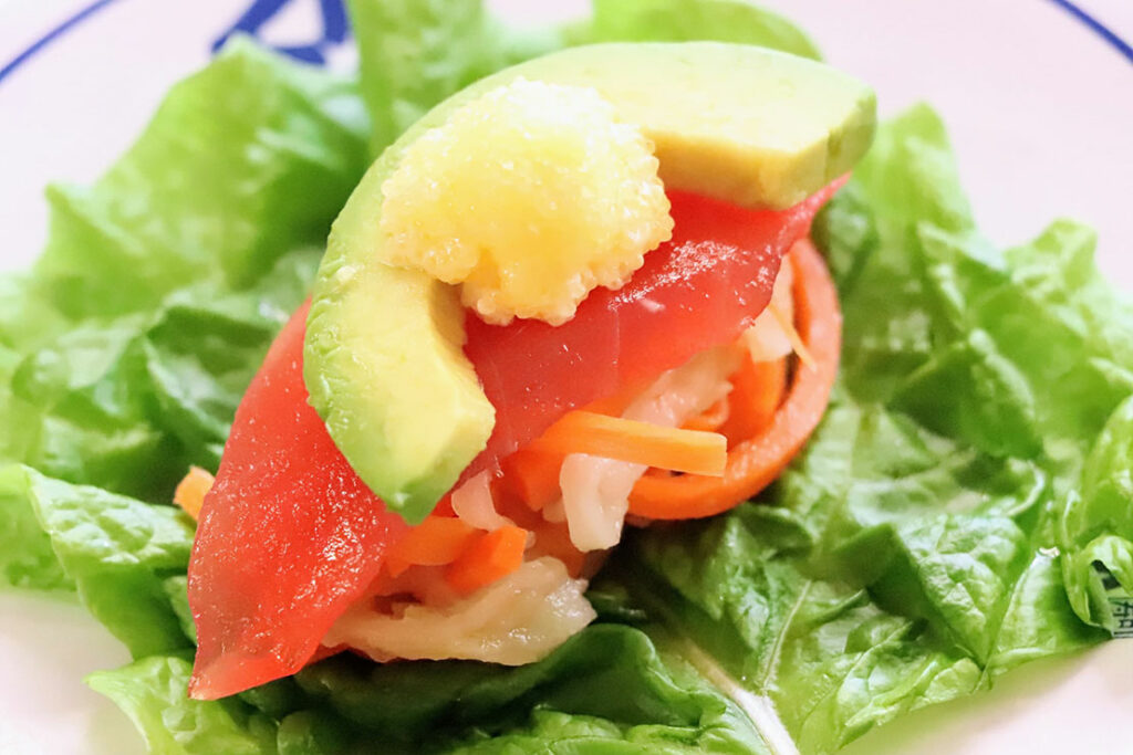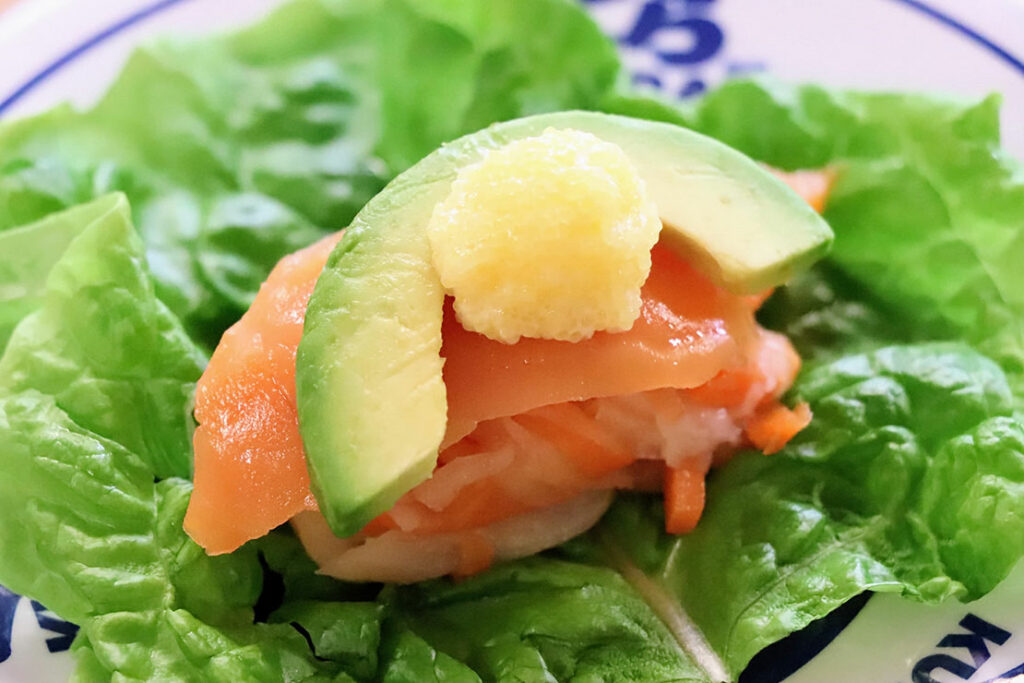まぐろと同じく、大根と人参の酢漬けをシャリ代わりに使用。数の子マヨがサーモンと野菜をまろやかにまとめ、ビタミンE×β-カロテンで美容と健康をサポート。