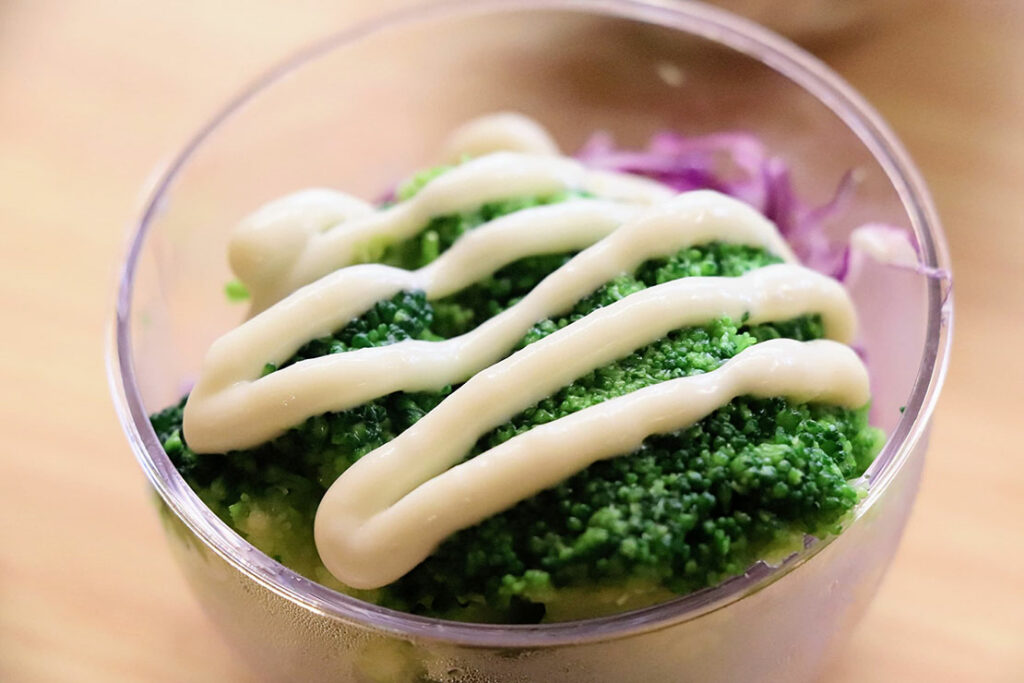 にんにく入りアンチョビマヨがアクセント。スルフォラファン × アントシアニンでエイジングに寄り添う栄養をプラス。アンチョビマヨが癖になるカップ。