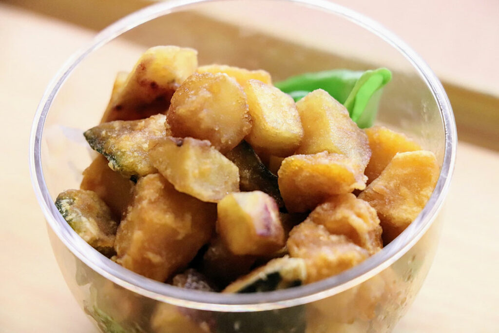 揚げたかぼちゃとさつまいもの甘さにバルサミコの酸味が好相性。β-カロテン×食物繊維で腸内活性化。店内で仕込む素材はおいしい。