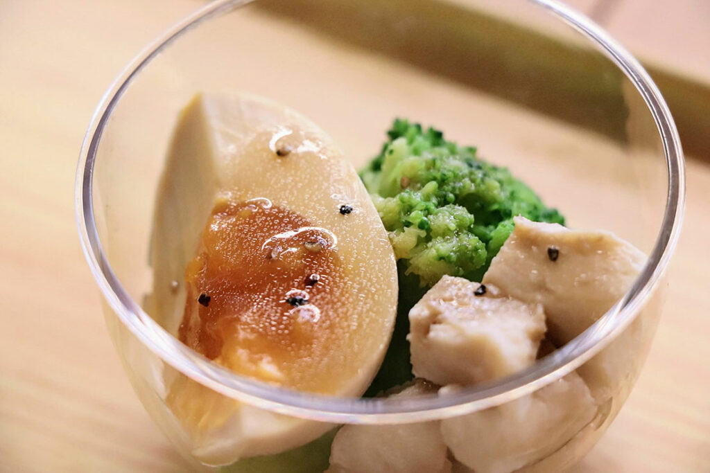 サラダチキンと卵を使った小ぶりなサラダ。たんぱく質・ビタミンD・葉酸で健やかな毎日を過ごせるぞ。これは美味しい。