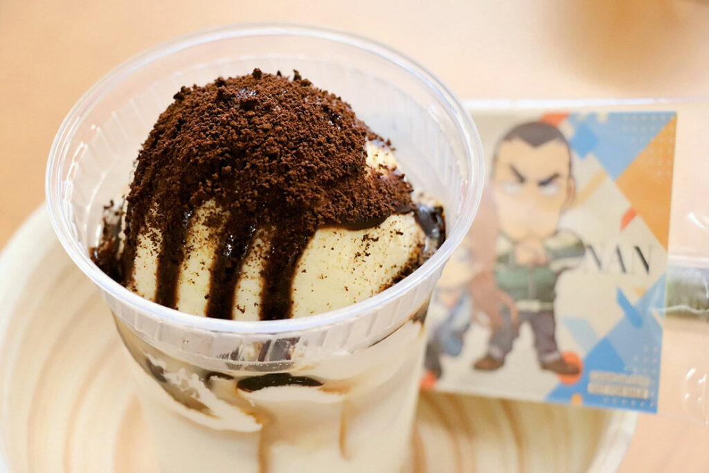 萩原千速をイメージし、ホイップとバニラアイスで白を表現。横溝重悟のブラックコーヒー習慣からコーヒーゼリーとコーヒーパウダーを使用。下層の苦みにミルクの甘さが重なり、混ぜるほど苦みと甘みの変化が楽しめる。