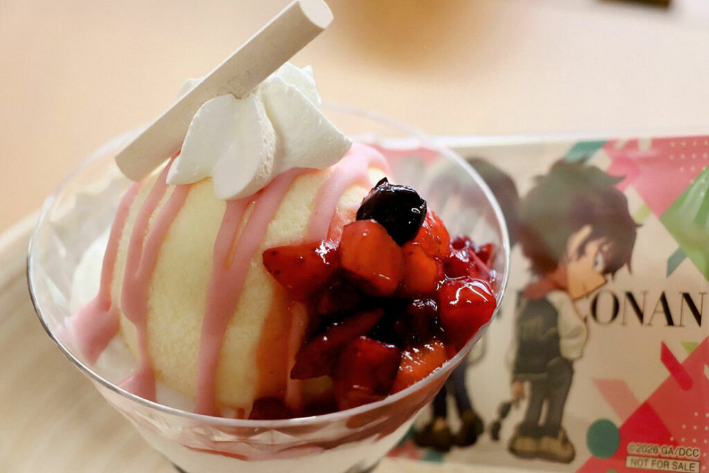 松田陣平をイメージしたビターチョコに、荻原研二の優しさをミルクホイップといちごソースで表現。チョコフレーク&チョコプリンで軽やかなチョコ感、スポンジとホイップでふんわり甘さをプラス。ビター × 甘酸っぱいベリーが “相棒感” を生む一品。