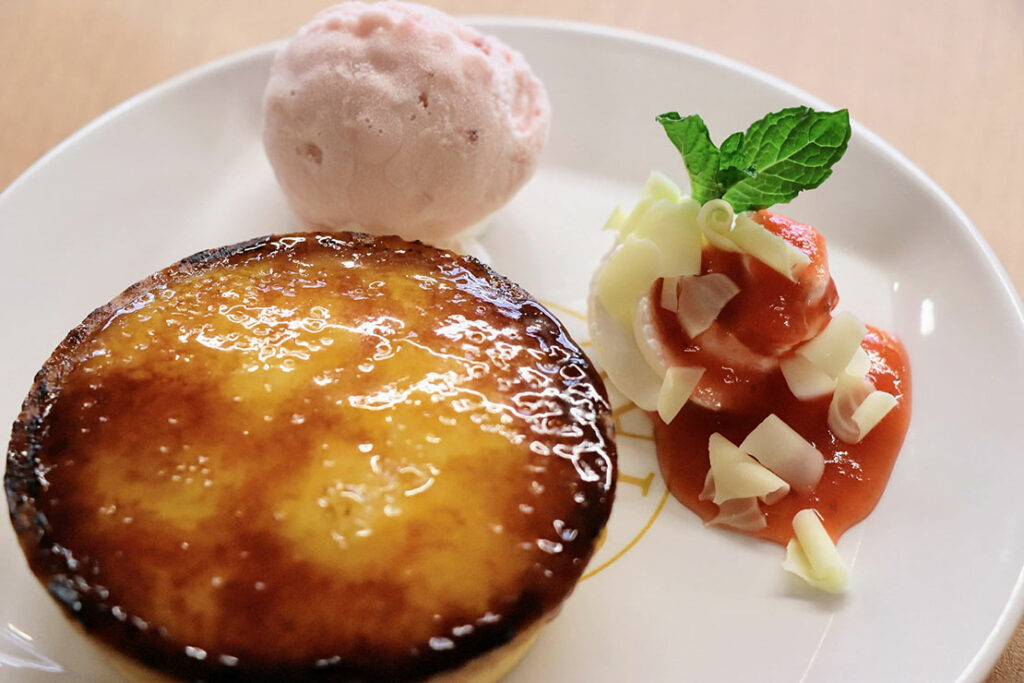 KURA ROYALからは、提供直前にキャラメリゼすることで、多彩な食感が楽しめる一品が登場する。表面のキャラメルをバーナーで丁寧に焼き上げる、ひと手間かけたデザートだ。甘いぞー!