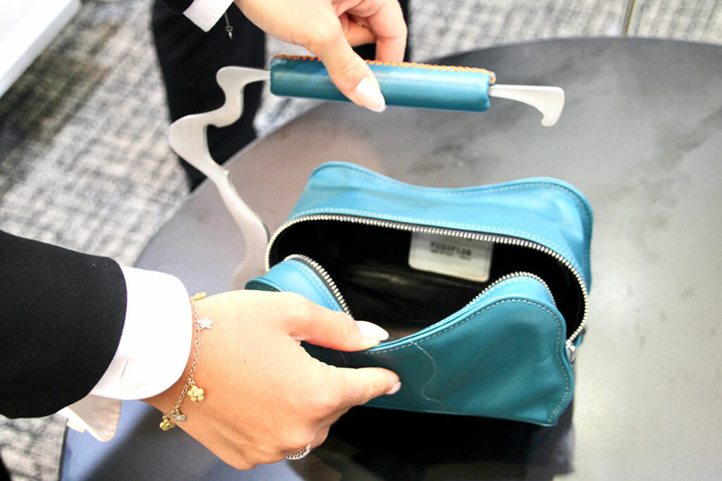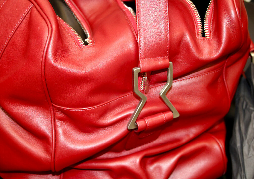 外装にカーフスキンを用い、内側はナッパレザーが施された作り。遊び心のある芸術的なフォルムながら、中に充分に小物を収納することができる。