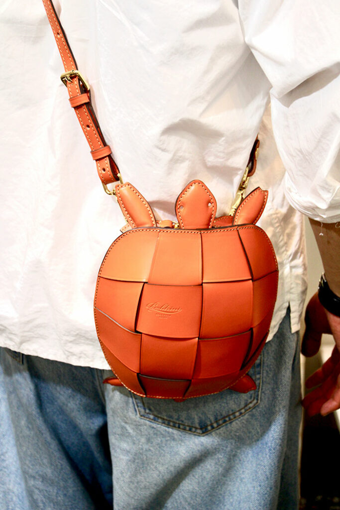 ユニークなカメのデザインをイントレで表現したショルダーバッグ。可愛い中にも職人の技術の高さが伺える。スマホや財布など、小物を収納することができる。(7597Bis 想定価格9万2000円)