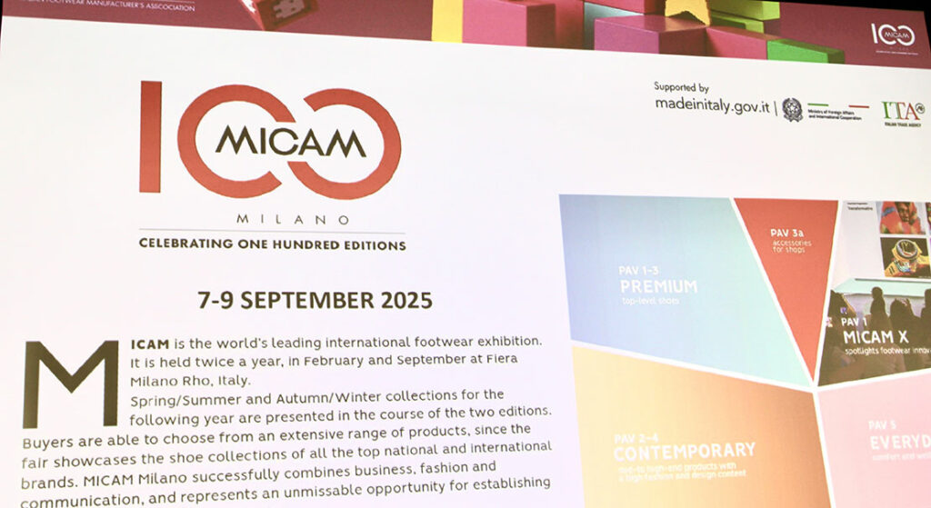 続いて、9月にミラノで開催される見本市「MIPEL128」と「第100回MICAM Milano」の先取り情報と、メイド・イン・イタリーのレザー製品とシューズのクオリティとクリエイティビティにフォーカスした内容が紹介された。