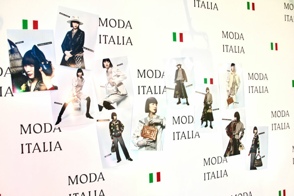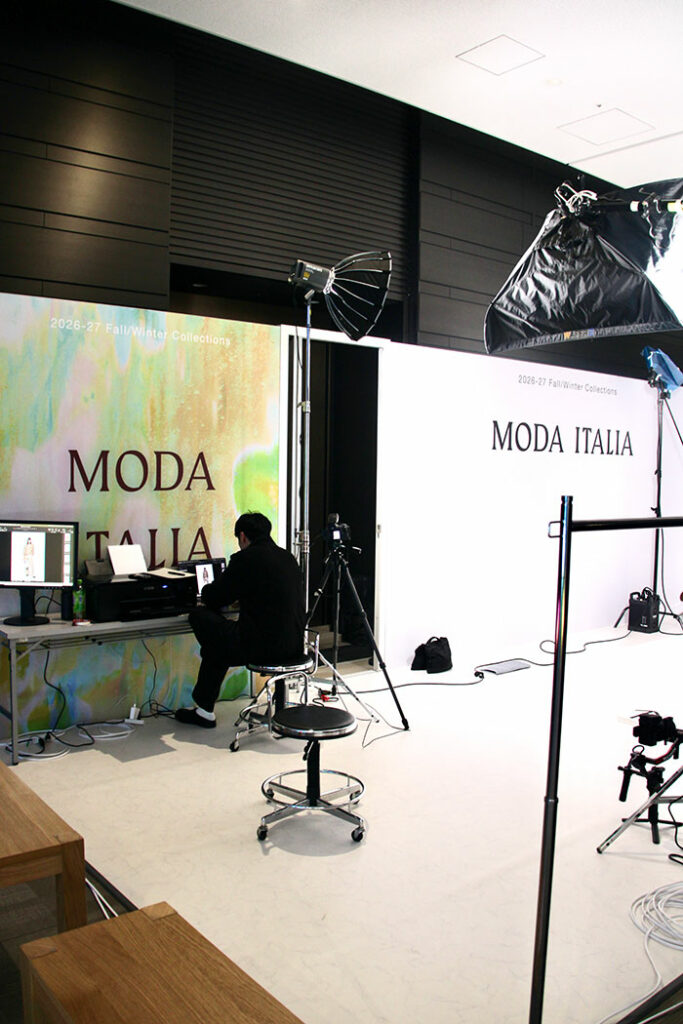 会場内の撮影エリアでモデルがアイテムを着用し、イタリアファッションの魅力を最大限に表現!
