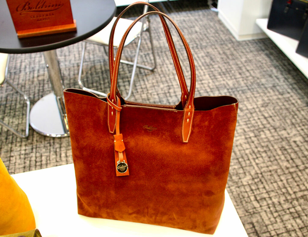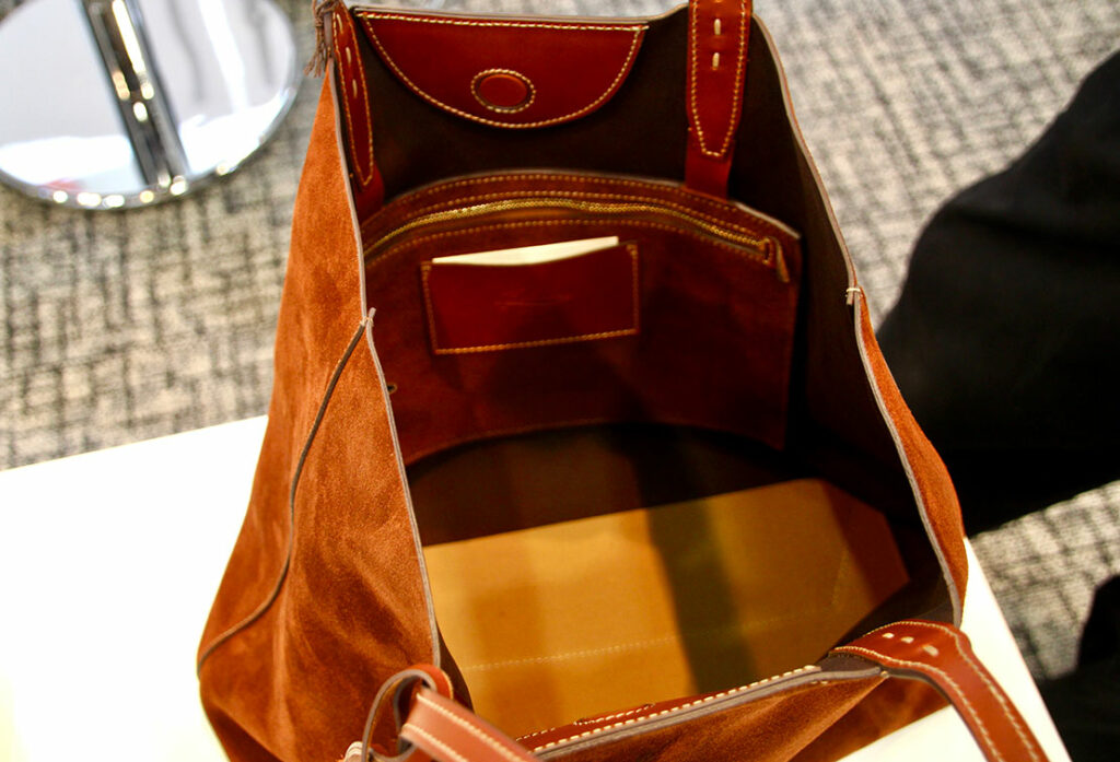 スエードコレクションの新作のトートバッグは、ユニセックスに使える使い勝手の良いサイズ感。クタッとした仕上がりがリュクスな印象を与えてくれる。(1228 想定価格8万8000円)
