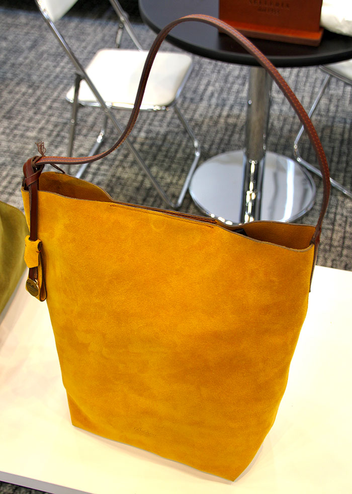 スエードコレクションの新作。秋の装いにぴったりなイエローのワンショルダーは、スエード素材なので派手になりすぎず上品な印象に。便利なポーチ付き。(1219 想定価格8万2000円前後)