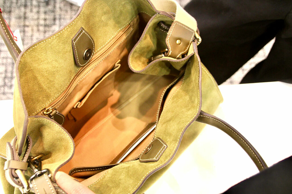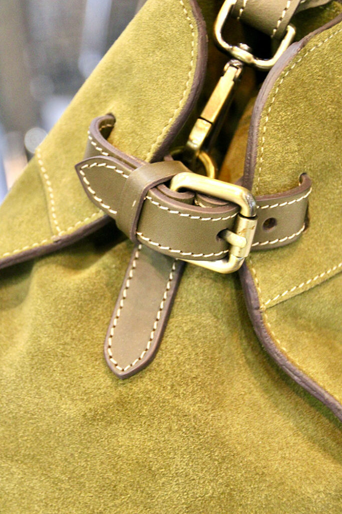 オリーブ色のスエードがトラッドなムードを醸し出す。サイドの金具を調整すれば幅を調節できるので、用途や荷物の容量に応じて使い分けることができて便利! 秋冬の装いにプラスすれば、さり気なく個性を表現できそう。