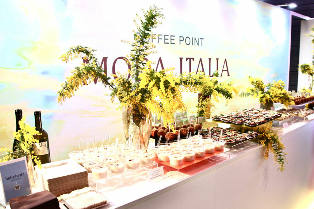 レセプションエリアでは、DJブースが設置され、イタリアン・エスプレッソや、ワインなどが提供され、出展者、来場者ともに楽しめるイベントとして、大盛り上がり!