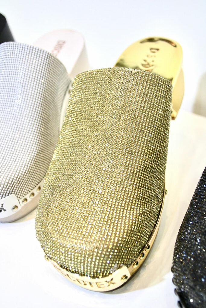 外装にスワロフスキーを豪華にあしらった、美しいイタリアの木靴「zoccolo(ゾッコロ)」。キラキラと輝く眩さは、まさに高級感を演出している。イタリアでは、もともと中世貴族の履物として、高潮対策に用いた厚底の履物であったという。