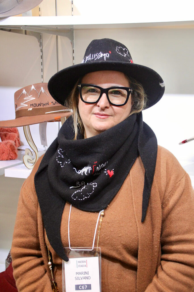 現在代表を務める、ナイーダ・マリーニ(Naida Marini)氏。「今季のトレンドは、帽子と三角形のスカーフの組み合わせです。セットで身に付けることで、お洒落な雰囲気を纏えますよ!」と話す、マリーニ・シルヴァーノ代表のナイーダさん。