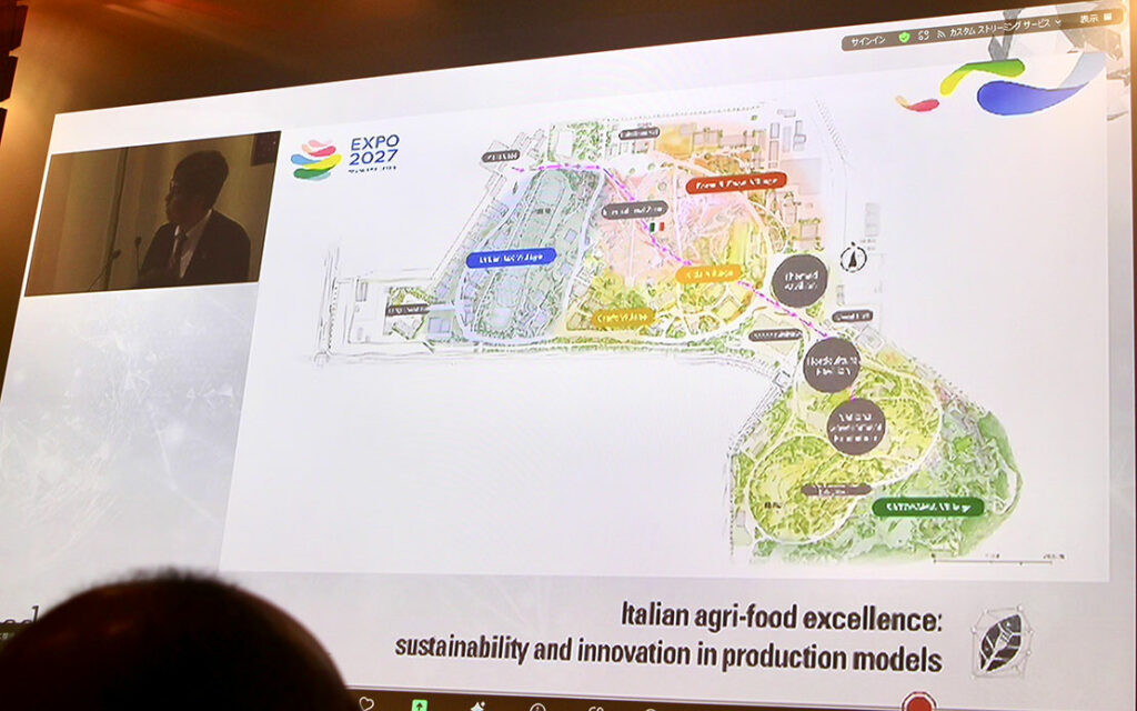 「『GREEN × EXPO 2027』への道のり(Road to Green Expo 2027)」と題し、駐日イタリア大使館で行われたセミナーでは、イタリアの農産物の持続可能性やその革新性が語られた。