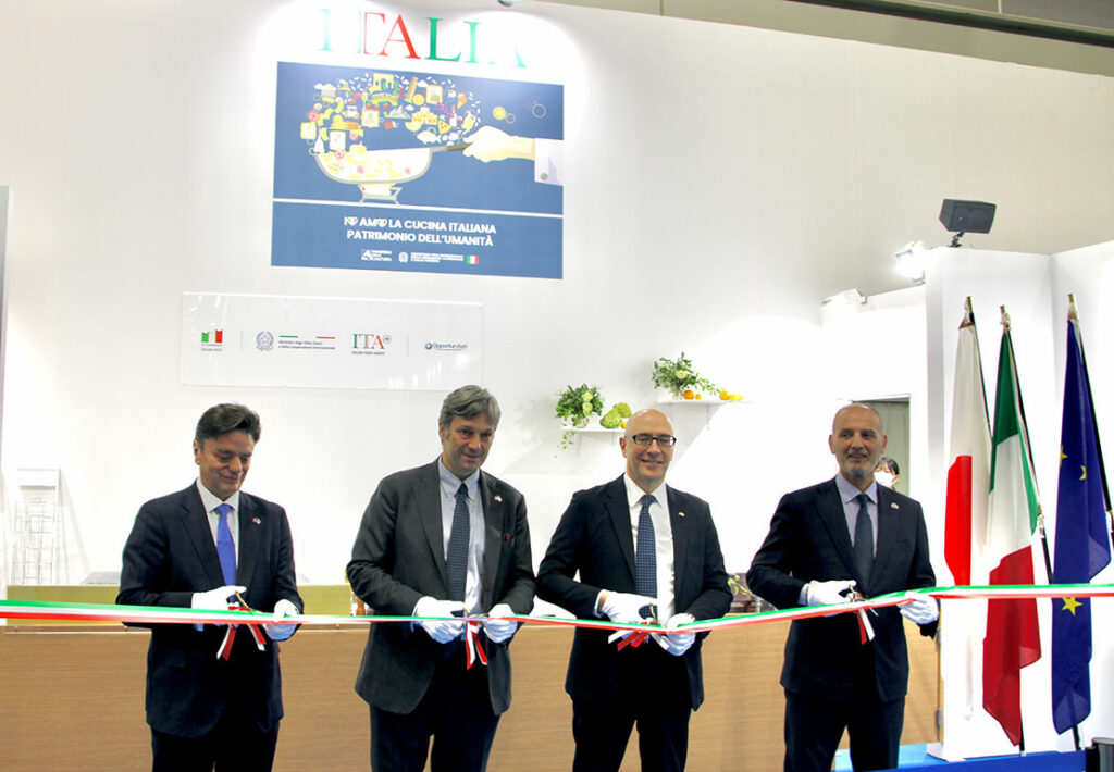 初日に開催されたオープニングでは、(右から)ラッファエッレ・ボッリエッロ(Raffaele Borriello)イタリア農業・食料主権・森林省(MASAF)官房長、マリオ・アンドレア・ヴァッターニ(Mario Andrea Vattani)駐日イタリア大使、イタリア貿易促進機構会長のマッテオ・ゾッパス(Matteo Zoppas)氏、貿易促進部 部長のジャンパオロ・ブルーノ(Gianpaolo Bruno)氏ら関係者が集まり、テープカットが行われ、イタリア館の開催を盛大に祝わった。