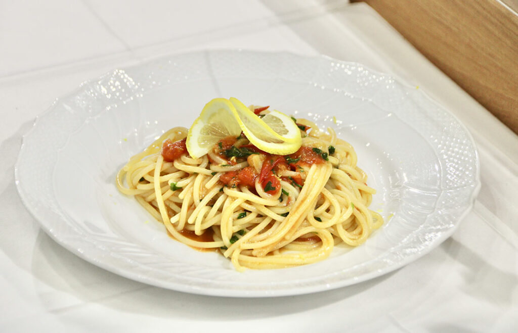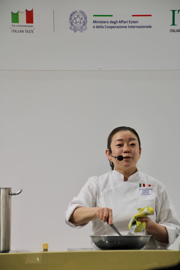 初日には、京都にある「カンティーナ アルコ」の清水美絵シェフが登壇し、カタクチイワシを発酵させ熟成して作られるイタリアの魚醤ともいわれる調味料「コラトゥーラ(Colatura di alici)」を用いたパスタ「ミニトマトとレモンのスパゲティ」を披露!