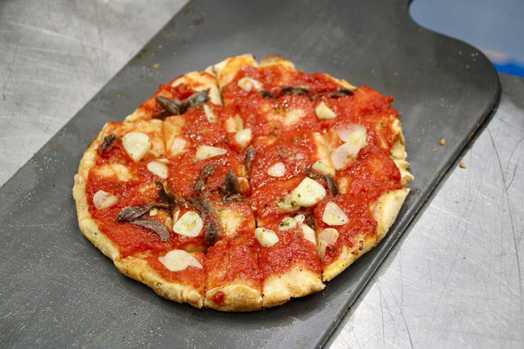 大豆粉、米粉、小麦粉と乾燥マザー酵母などを配合した粉を使い、ゆっくりと熟成・発酵させる。生地には水分が80%以上含まれており、具を乗せる前後に二回の焼き上げを行うそう。そのため、表面はカリッと、中はフワフワの食感で、美味しい味わいで消化しやすいのが特徴だ。