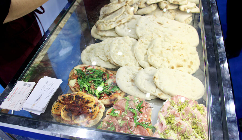 また、ピンサコーナーでは、22の出展者による、具材を詰めた「ピンサ(Pinsa)」を紹介! 「ピンサ」は、2001年にローマで生まれた進化形ピッツァ(Pizza)のことで、その特徴は生地にある。