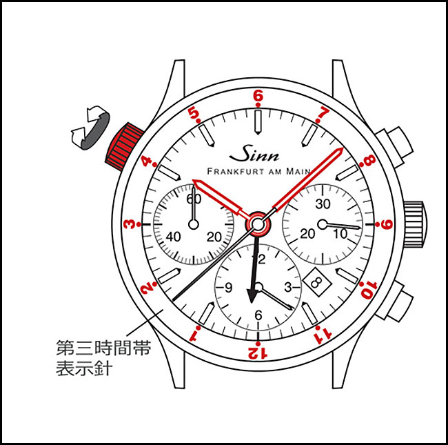 第二時間帯は矢印形状のUTC針と分針で読み取ることができる。UTC針の設定は巻き上げリューズを使う。UTC針は1時間刻みで動く。
