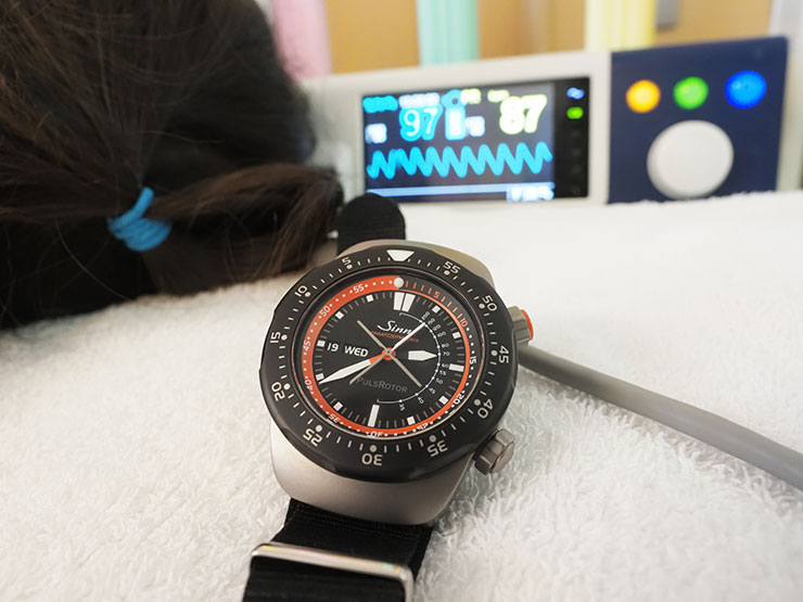 かなり特徴のある4枚羽ローターのような秒針と、捥時計と言うには極めて大柄で肉厚なEZM12はドイツでドクターヘリでの航空救命活動に従事する医師の協力を得て開発されたツールなのであり、一分一秒を争う救命救急の現場での使用を想定している。目を引く大型のカウントダウン式回転ベゼルは1500ビッカースもの硬度のテギメント加工され傷や腐食にめっぽう強い処理をされており、ベゼル上側のオレンジ色のリューズで操作するカウントアップ式インナーベゼルと合わせ、救急活動における「プラチナの10分」と「黄金の1時間」を確実に読み取るための配慮が成されている。そしてヘリコプターのローターをイメージさせる秒針は心拍数測定用パルスメーターとして機能し、4本のうちどの針でもよいので12時位置より心拍を15回カウントした時点で示すベゼル内の数値が1分間の心拍に換算できるのである。