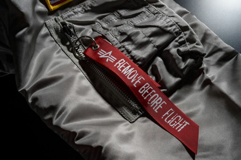 L-2Bにはスペック(仕様)の異なるバリエーションが存在するが、本製品はアルファ社が1970~79年まで空軍に納入した、最終モデルのMIL-J-7448Jがベース。製品はリバーシブル仕様ではなく、裏の左胸にポケットが付く。両胸にスコードロン・パッチ(飛行隊章)、右肩にF-101ブードゥ戦闘機の後席レーダー要員パッチが付き、左胸のパッチは糸をパイル状にしたサガラ(相良)刺繍製。素材は軽量で耐久性のあるフライトナイロンで、色はグレーとブルーの2種類。
