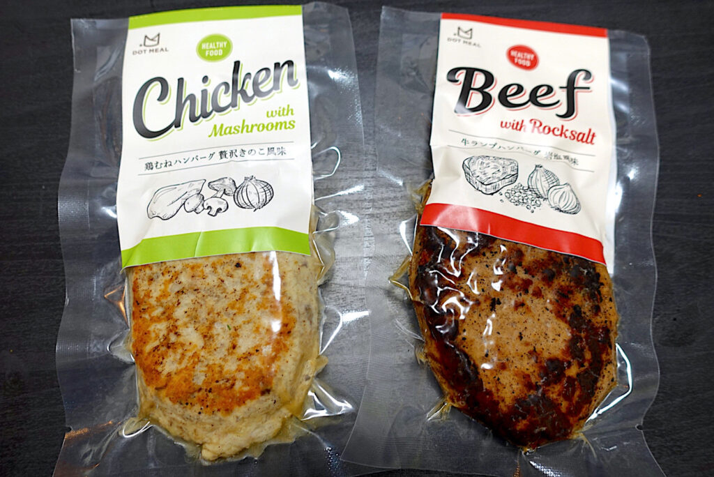 まずはハンバーグ。3種類あり、すべて職人がジューシーに手焼きしたものが冷凍で届きます。現在、豚ヒレハンバーグのみ改良中とのことで、試食は鶏と牛の2種類。食べ方は非常に簡単で、パッケージごと10分ほど湯煎するか、中身を取り出して電子レンジでチンするだけ! 賞味期限は製造から3ヶ月と長いため、6個セットでも十分食べきれそうです。