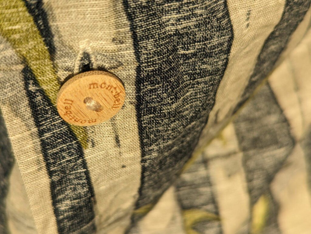 アロハシャツのボタンは、ココナッツ素材になっているものが多いと思うが、こちらのタケロハもナチュラルな風合いを持った竹素材になっているのがいい。よく見ると「mont-bell」のロゴマークも付いている、芸が細かい。