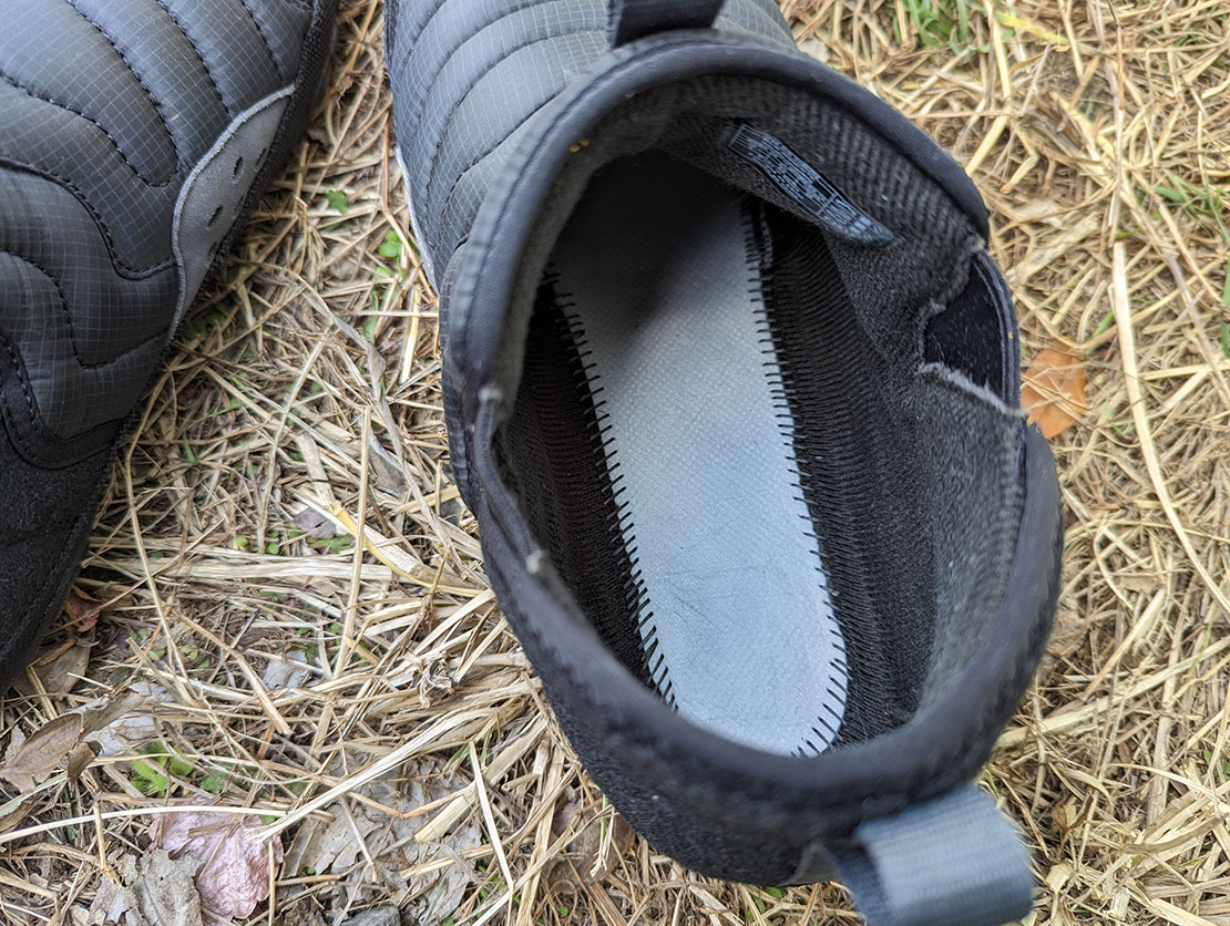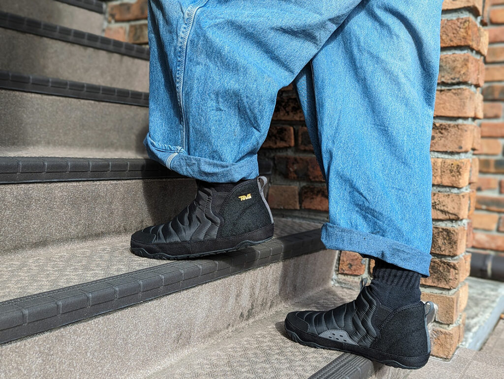 そんなテバのラインナップの中でもこちらのリエンバー テレイン ミッドは、サンダルではなくモックタイプのシューズ。街で履くのにも快適で、シンプルなデザインなのでファッションにも合わせやすく、脱ぎ履きの多いキャンプシーンや不整地が多い公園などを歩くのにもちょうどいい。それでいてキルティングのアッパーのため、とにもかくにも暖かい! まだ寒い日が続いているので、末端冷え性の僕には有難い存在。ローカットでスリッポンタイプのリエンバー 2に比べると履き口がかなり狭いので、ちょっと分厚い靴下で履いてから慣らすともっとコンフォートなシューズに。