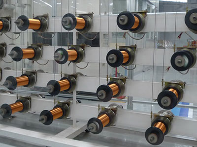 (左)工場の3Fでユニットと本体を効率よく組み立てる。(右)加熱コイルユニットは最大で1600本の極細線を1本の撚り線に練り上げていく。