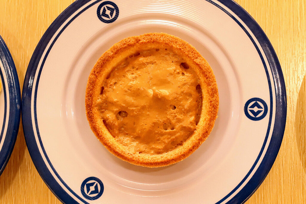 アイルランドの伝統的なジャガイモパンケーキを再現した一品。ジャガイモをすりつぶして塩・胡椒でシンプルに味付けし、しっとりとした食感がやみつきになる。トッピングには濃厚なチェダーチーズソースがかかり、ベビーリーフが添えられているのが特徴だ。この料理は、アイルランド北部で朝食やハロウィンの時期によく食べられるもので、くら寿司の万博応援企画の一環として提供されている。大使館の試食会でも絶賛された、ふわふわ&もちもちの食感がクセになる、日本の「いも餅」に似た味わいが楽しめる。チェダーチーズソースがパンケーキを引き立てる美味しさだ。