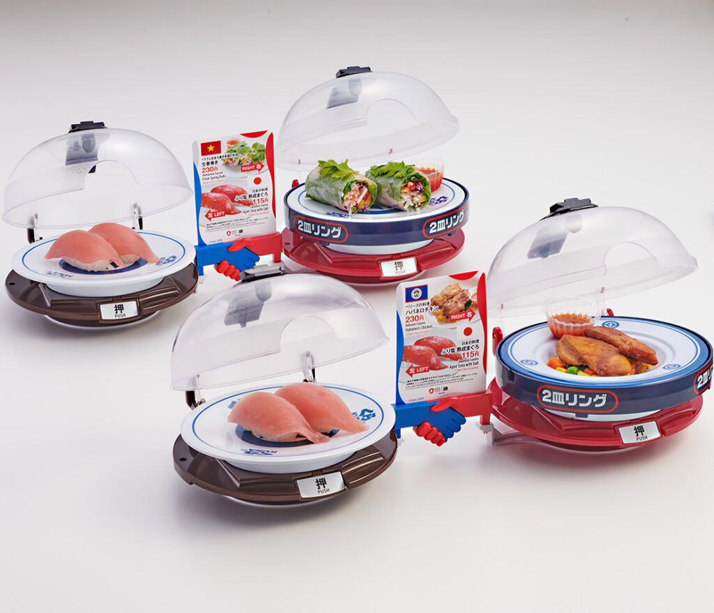 くら寿司のアイコンである回転ベルトは、ここ大阪関西万博店でも健在。最新技術との融合により、国内外の多彩な料理が流れる仕組みは、従来の寿司文化に新たな風を吹き込み、世界観豊かな食体験を演出している。