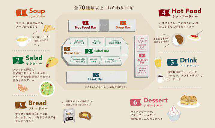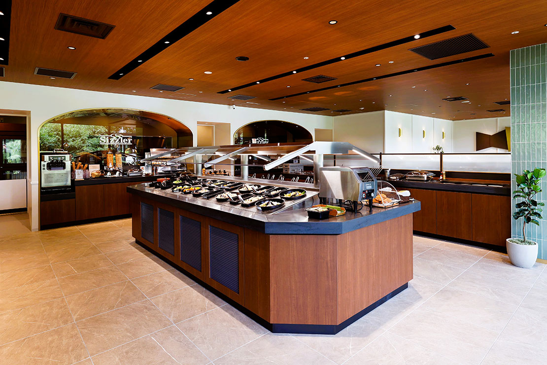 リニューアルポイントは、広々キッチンでのケイタリングパーティーをイメージしたデザイン。サラダバー本体のサイズダウンにより、以前より通路幅を確保し利便性を向上させている。