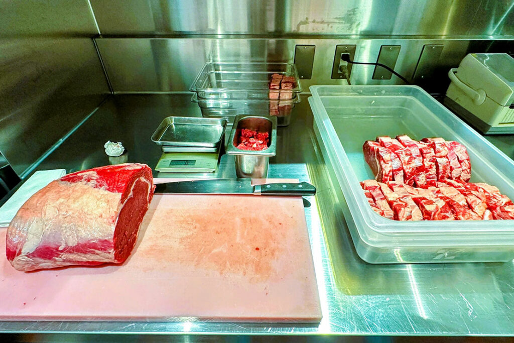 リブロースステーキは、かたまり肉をチルドで納品、店舗スタッフが筋切りや余分な脂身の除去などの下処理を丁寧に行って、1枚ずつ手切りしている。美味しさを保つため、店舗には氷温帯(0℃前後)で保管可能なチルド庫を設置し、肉の鮮度と風味をキープしているのだ。手切りの際に出る端肉は、細かくカットして焼成し、サラダバー内の「ビーフカレー」に活用。素材を無駄にせず、美味しさとして還元する工夫をしている。さすがシズラーだ!