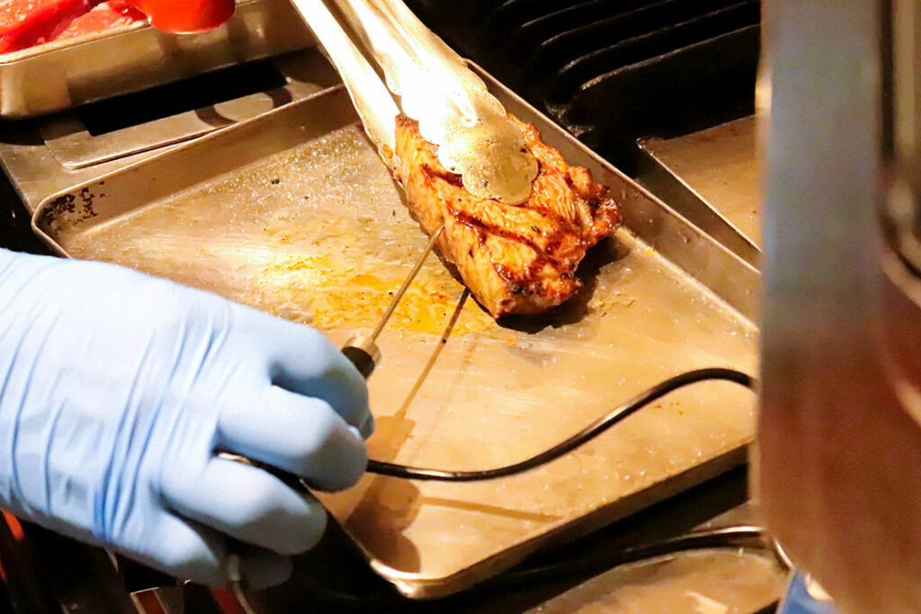 ステーキをオーダー通りの焼き加減に焼き上げ、またチキンやポークの肉の中心にまで火が通っているかを確認するために行うのが「プローブチェック」だ。素材の中心部にむけて、温度計の感知針を挿入し、中央の温度を測定。温度を確認し、それをステーキ調理チャートと比較するのだ。