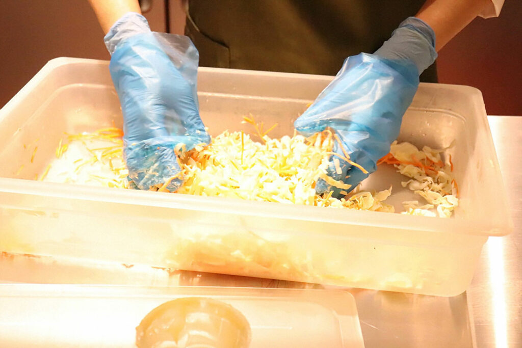 デリサラダは、素材ごとに下準備を行い、提供直前にドレッシングと和えることで、水分が出るのを防ぎ、フレッシュな食感と彩りをキープしている。
